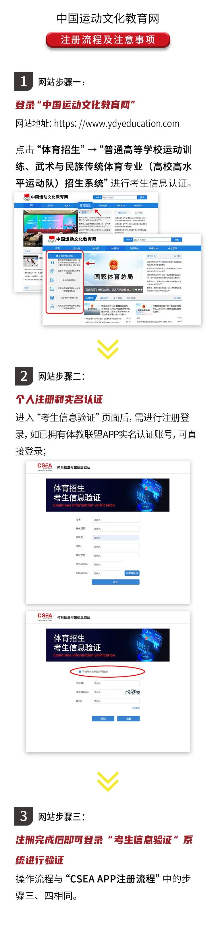 考生的信息注册验证工作将统一在“中国运动文化教育网”(www.ydyeducation.com)或“体教联盟APP”中“体育单招系统”内完成,请考生错峰进行注册验证。