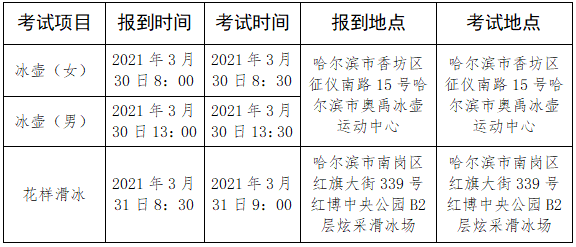 参加2021年全国运动训练专业冰壶、花样滑冰体育专项考试的各位考生,哈尔滨体育学院考点冰壶、花样滑冰体育专项考试相关事宜公布如下,敬请各位考生按照公布时间和地点报到、参加考试。