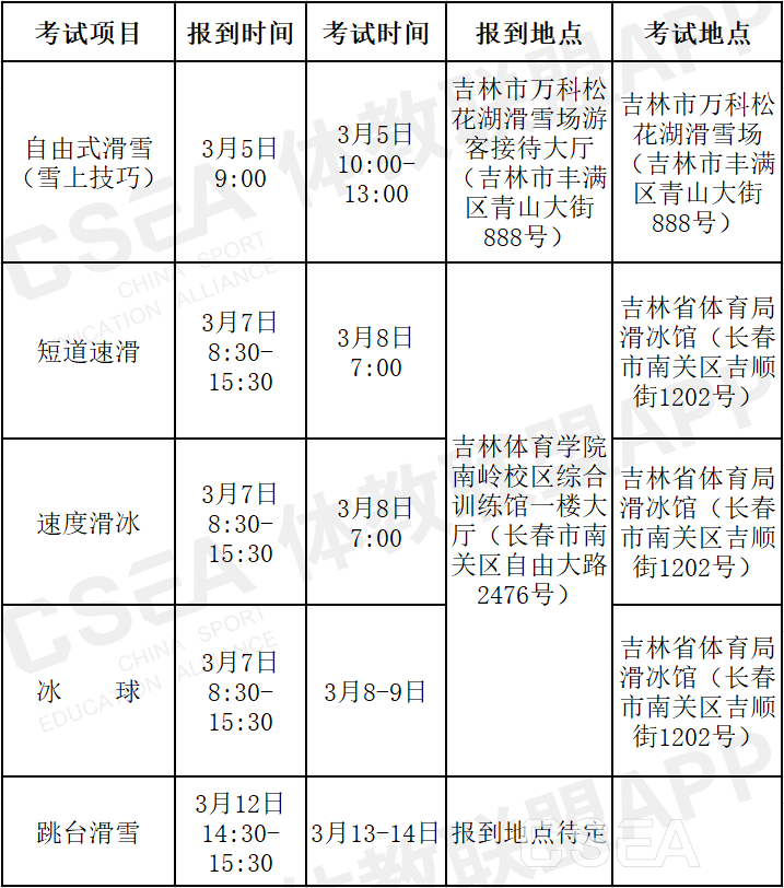 参加短道速滑、速度滑冰、冰球、跳台滑雪、自由式滑雪(雪上技巧)体育专项考试的各位考生,按照国家体育总局科教司考试工作安排,吉林体育学院考点将短道速滑、速度滑冰、冰球、跳台滑雪、自由式滑雪(雪上技巧)体育专项考试相关事宜公布如下,敬请各位考生及家长按照公布时间和地点报到、参加考试。
