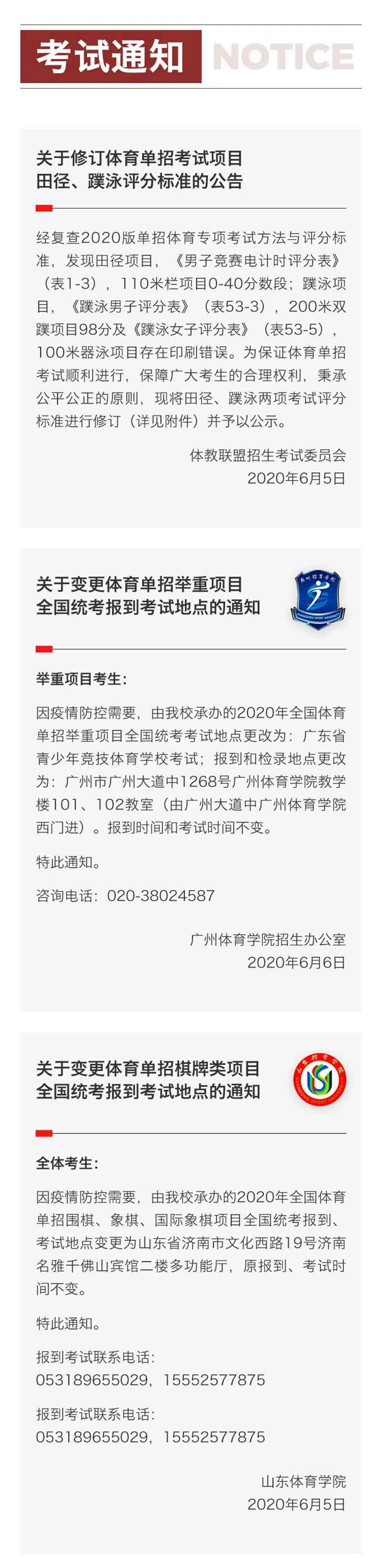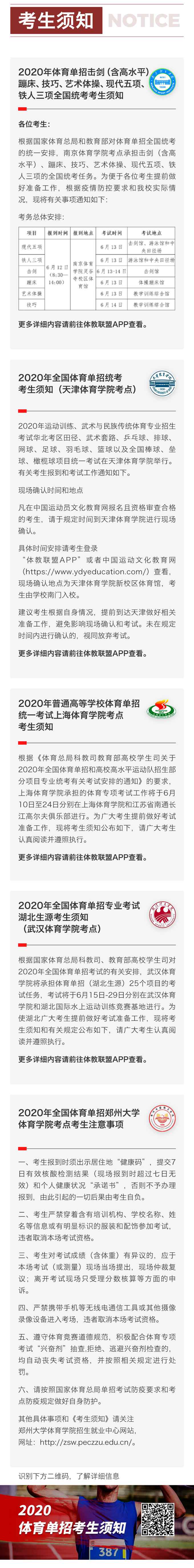 2020年体育单招考试变更通知及各体育学院考点考生须知