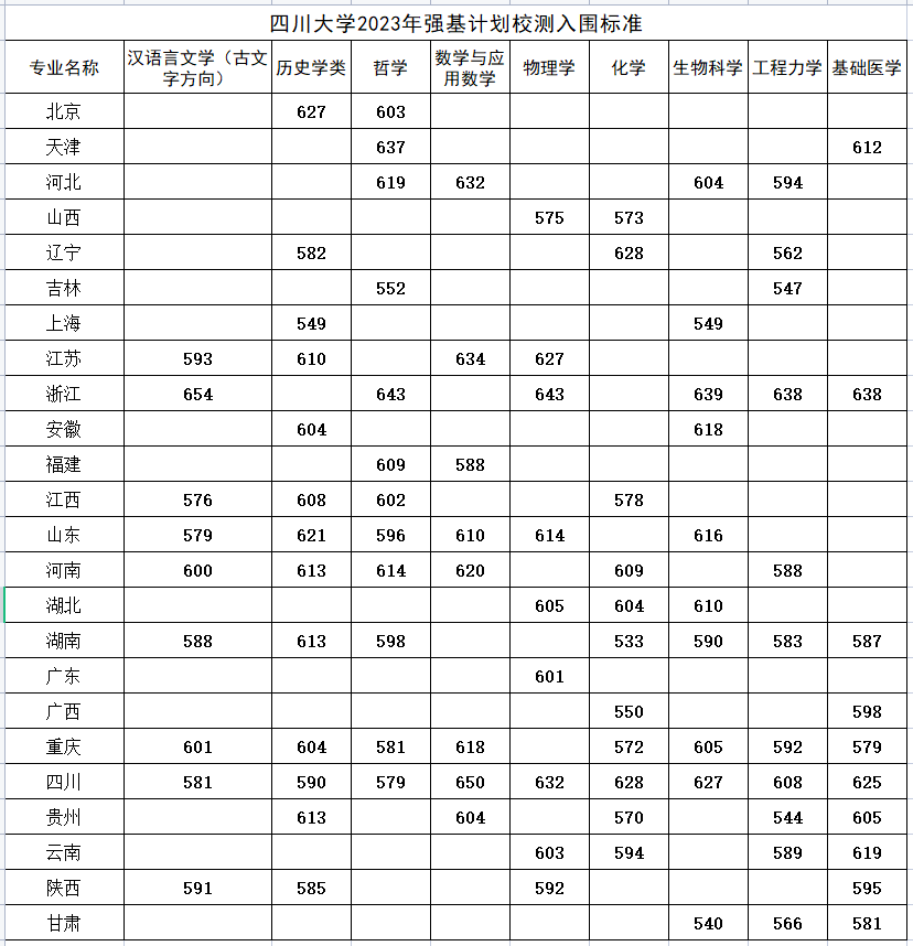 川大2023年强基分数线在四川、重庆有下滑情况,分数线较2022年下降 20-40分之间,例如: