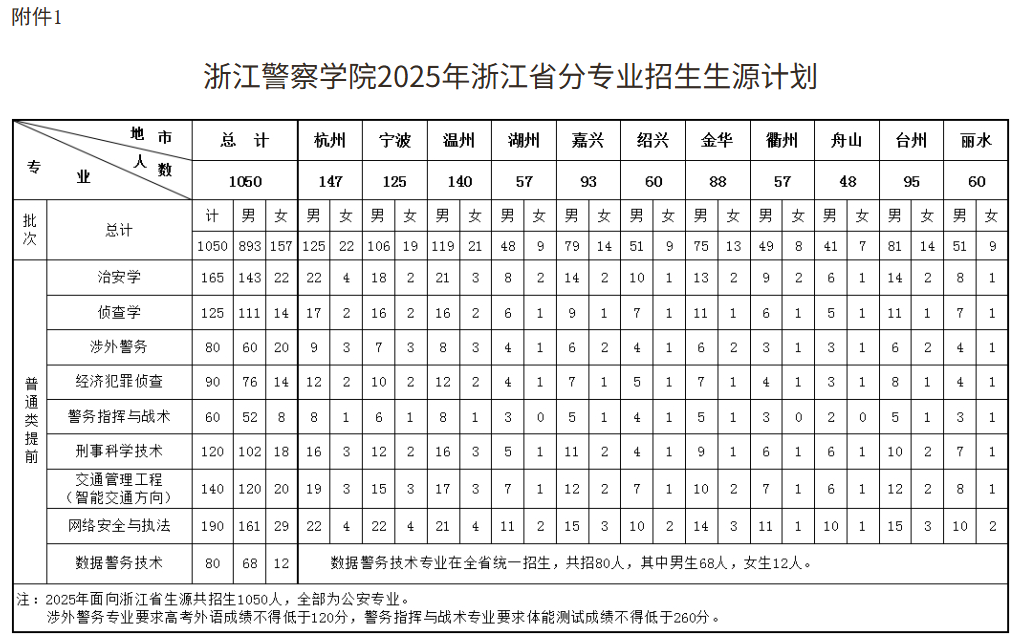 附件:1.浙江警察学院2025年浙江省分专业招生生源计划