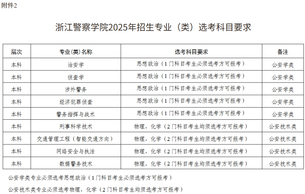 2.浙江警察学院2025年招生专业(类)选考科目要求
